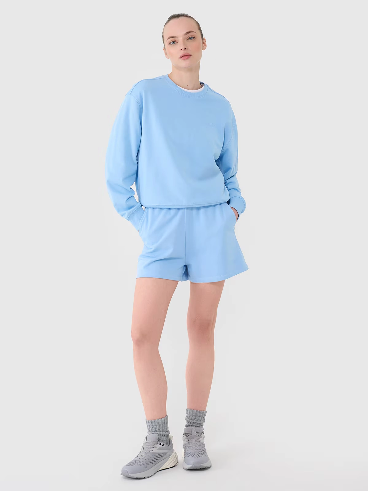 Bluza dresowa nierozpinana dla kobiety jest wykonana w 79% z bawełny, dzięki czemu jest miękka, trwała i przyjemna w dotyku. Dzięki dodatkowi poliestru (20%) materiał utrzymuje fason i jest odporny na zużycie nawet przez wiele sezonów. Okrągły dekolt jest zakończony lekkim ribowaniem. Elastyczne mankiety ze ściągaczem. Dół z szerokim ściągaczem.