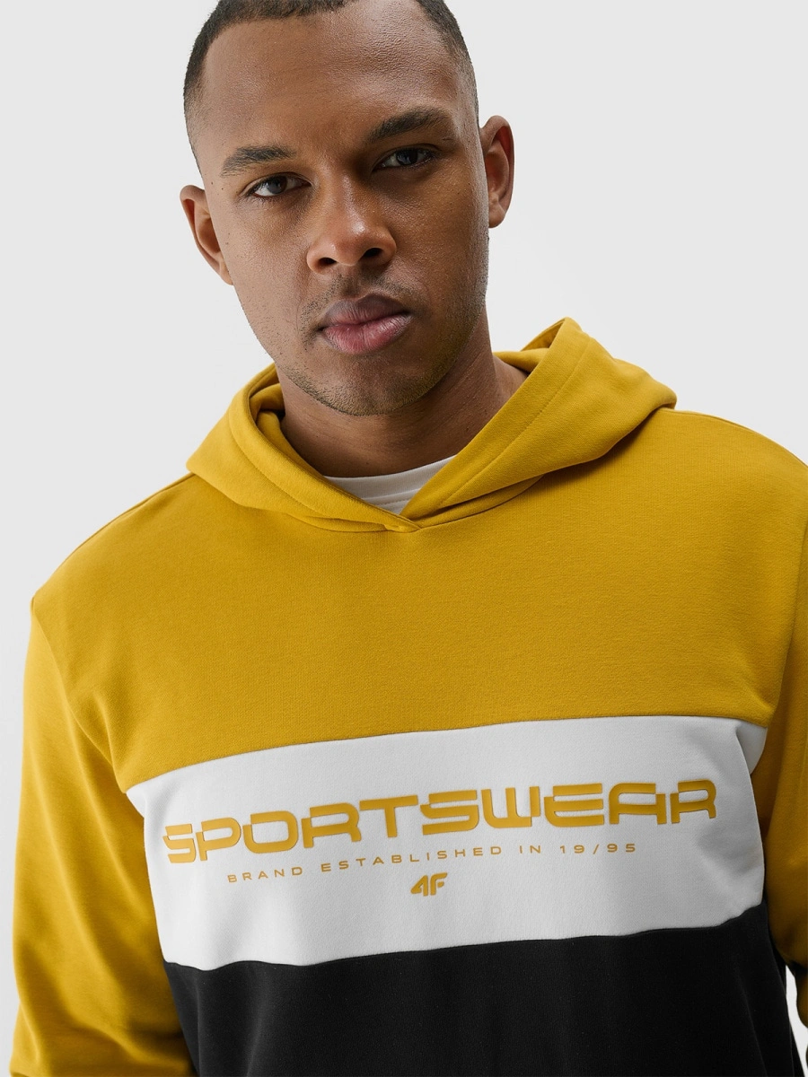 Bluza dresowa męska z kapturem 4F z linii COLOUR BLOCKING to połączenie miejskiego stylu inspirowanego współczesną architekturą oraz codziennego komfortu użytkowania. Charakterystyczne bloki kolorów w odcieniach granatu, szarości, żółci i brązu, uzupełnione wyrazistym nadrukiem typograficznym „Sportswear”, podkreślają nowoczesny, streetwearowy charakter bluzy. Krój regular zapewnia wygodne dopasowanie do sylwetki, a dzianina dresowa french terry – gładka na zewnątrz i z pętelkowym splotem od wewnątrz – jest miękka, lekka i bardziej przewiewna, dzięki czemu bluza sprawdzi się zarówno w stylizacjach casualowych, jak i sportowych. Średnia gramatura 340 gsm daje przyjemne poczucie jakości bez nadmiernego obciążenia, a wysoka zawartość bawełny (79%) gwarantuje komfort noszenia, trwałość i przyjemność w dotyku. Zintegrowany kaptur, kieszeń kangurka oraz elastyczne ściągacze zwiększają funkcjonalność na co dzień.