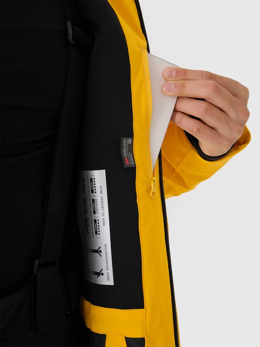Praktyczny układ kieszeni obejmuje kieszenie boczne na zamek, kieszeń piersiową z laminowanym zamkiem, kieszeń ski pass na ramieniu oraz wewnętrzne kieszenie – w tym siatkową kieszeń na gogle. Zintegrowany pas śnieżny zapobiega przedostawaniu się śniegu do wnętrza kurtki, a wewnętrzny patch SOS zwiększa bezpieczeństwo w górach.